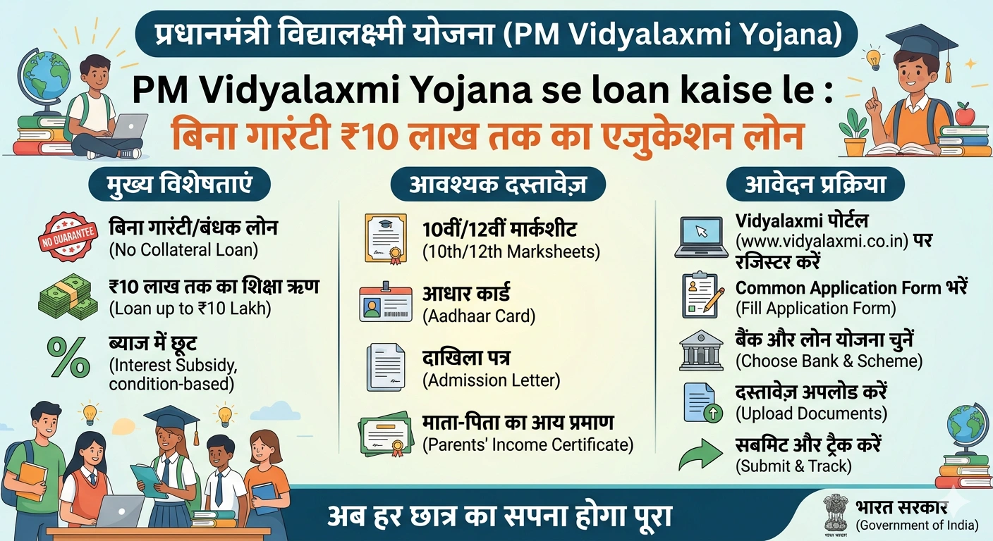 PM Vidyalaxmi Yojana 2026 : नमस्ते दोस्तों अगर आप या आपके बच्चे पैसों की कमी के कारण उच्च शिक्षा नहीं ले पा रहे हैं, तो केंद्र सरकार की PM Vidyalaxmi Yojana आपके लिए किसी वरदान से कम नहीं है, क्योकि इस योजना के माध्यम से बिना गारंटी के ₹10 लाख तक का एजुकेशन लोन दिया जा रहा है।